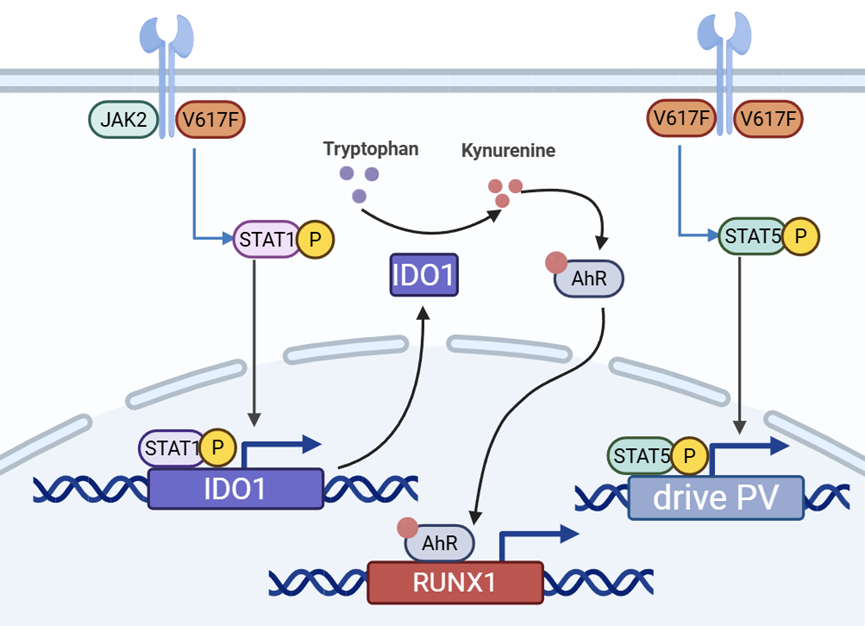 研究团队发现,不同的突变类型是决定疾病走向的关键。在 ET 患者中,JAK2V617F 主要以杂合突变形式存在,与正常 JAK2 形成异源二聚体,特异性激活 STAT1–AhR–RUNX1 信号轴,促使巨核-红系祖细胞(MEP)向巨核细胞分化,导致血小板异常升高。而在 PV 患者中,多为纯合 JAK2V617F形成的同源二聚体,激活 STAT5 信号通路,导致 MEP 偏向红系分化。研究团队还发现,PV 患者的 MEP 虽以纯合突变为主,但仍存在少量杂合突变细胞。该现象解释了部分 PV 患者出现血小板升高的临床现象。进一步,研究团队构建了人源化 JAK2V617F ET 小鼠模型,证实抑制 AhR 能有效阻遏血小板过度生成,且不影响红细胞、中性粒细胞等髓系细胞。